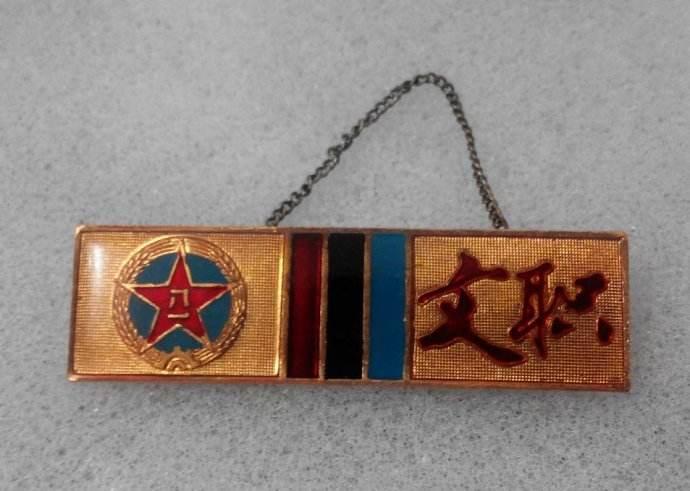 为标志文职干部的身份,设置了文职干部胸章。胸章的样式为长条形铝制品,长为65mm,宽为13mm。由直径为12mm陆军小帽徽图案和宽各为4mm的陆、海、空三军色标(红、黑、蓝)及文职拼音字母缩写“WZ”的字样组成。5.臂章