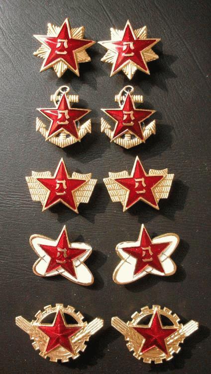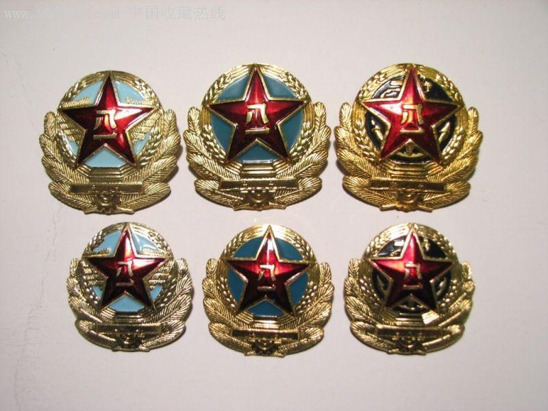 礼服领花。将官礼服领花的边为松枝叶,边内为五星图案,用金绣刺绣。校官礼服领花边为麦穗,边内为五星图案,仿刺绣铝制品。尉官礼服领花为仿刺绣光芒五星。