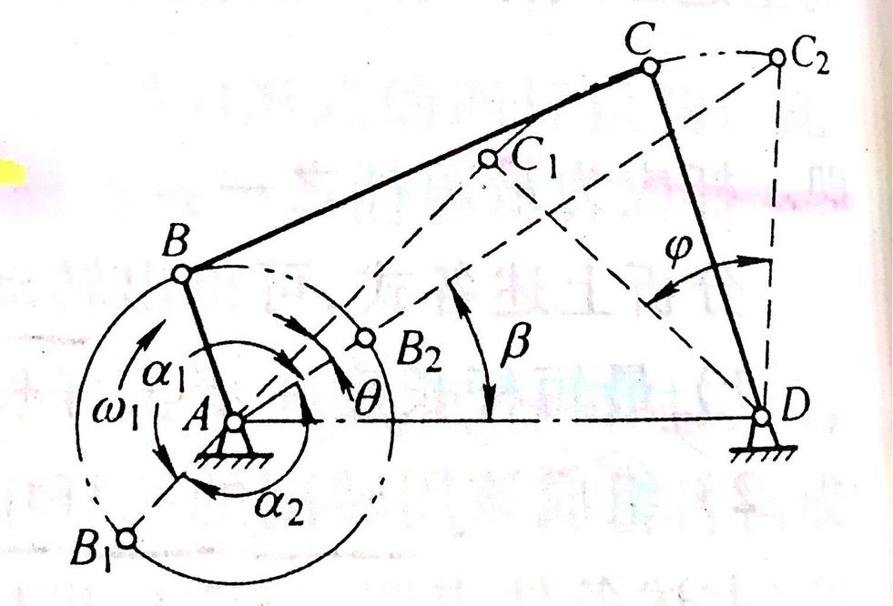 急回运动出现如图1所示,当曲柄以等角速度 顺时针转过时,摇杆将由位置 摆到,其摆角为,设所需时间为,点的平均速度为;当曲柄继续转过时,摇杆又从位置回转到,摆角仍然是,所需的时间是,点的平均速度为。由于曲柄为等角速度转动,而所以有。摇杆这种性质的运动称为急回运动。