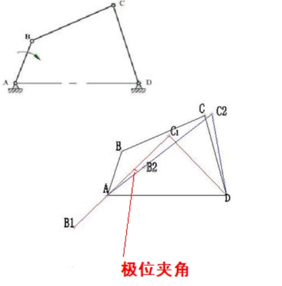 如图1所示为一曲柄摇杆机构,设曲柄AB为原动件,在其转动一周的过程中,有两次与连杆共线,这时摇杆CD分别处于两极限位置CD和CD。机构所处的这两个位置称为极位。机构在两个位置时,原动件AB所在两个位置之间的夹角称为极位夹角。