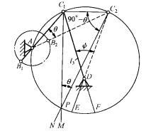 如图2所示,任选一点,由已知 杆长和摆角 画出其两极限位置并得到、铰链点。连接 再作。由已知的 代入式 计算出极位夹角。作。与 交于 点。由 三个内角之和为180°可知, 。作 的外接圆,在除 和 圆弧的圆弧上任选一点 作为固定铰链点。连接 和 得夹角 (同一圆周角相等)。因两极限位置处曲柄 和连杆 共线,故可得 在 的延长线上,在 线之间。先初取、点并使 和 相等。由其几何关系应得, ,于是得到曲柄。再以 为圆心 为半径作圆,交 的延长线于正式取得的 点,交至于于正式取得的 点。
