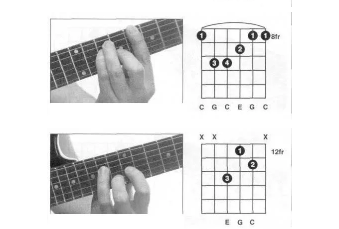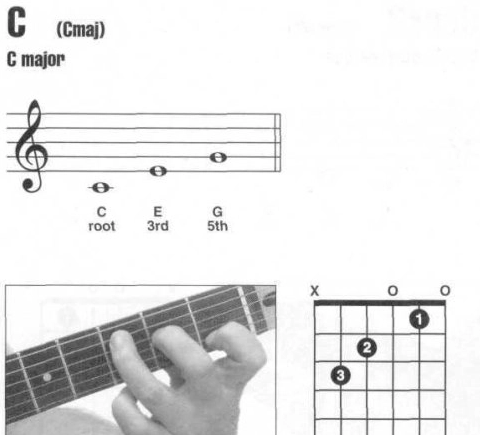 C和弦是由1、3、5三音叠置构成的大三和弦,是大调式的Ⅰ级主和弦,是小调式的Ⅲ级和弦。指法:左手食指按2弦1品,中指按4弦2品,无名指按5弦3品。 过去许多教材资料讲到所谓左手无名指按6弦3品,小指按5弦3品,中指按4弦2品,食指按2弦1品的按法,按和声学理论,应该为C的转位和弦,即C/G和弦。