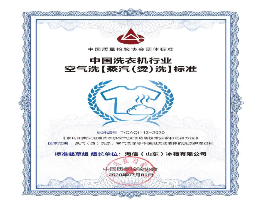 2020年7月,海信洗衣机成为行业蒸烫洗团体标准的牵头制定者和组长单位,并正式发布行业首项“离子蒸烫洗”科技,进一步奠定了行业蒸烫洗护专家的地位。 [14]
