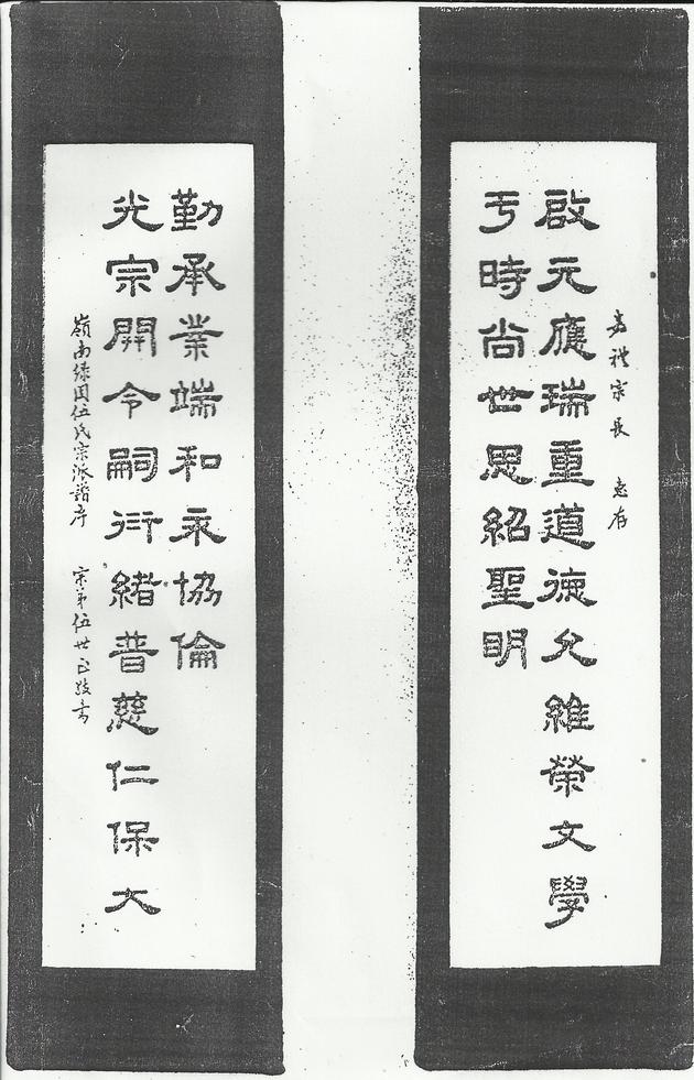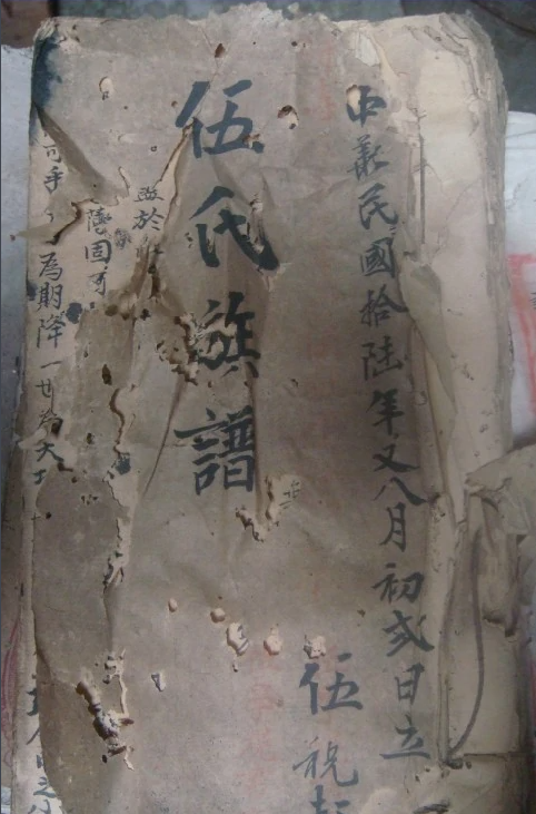 古炎帝神农之子曰永者封於河陇之地为雍侯至八世孙雍侯克公始都安定遂有安定之传至绍公虞帝封於椒是为椒侯后楚并椒以参公为楚大夫生举公封于伍地遂以伍为姓伍之得姓自举公始也参公仕楚穆王为左大夫举楚康王为大夫周景王时又仕楚灵王为左尹娶申宰子牟之女芊氏奢仕楚灵王上大夫又仕楚平王为大理官封於连为连尹民称为连公进为世子太师奢公生三子长曰尚次曰员三曰通尚公仕楚平王为大夫封於棠为棠宰多惠政民称曰棠君尚钟隠於武陵员公字子婿钟度辛广逃隠武陵度公辛公广公叔通公隠於武陵子孙因家焉迨至十三世被公度公琼公仕汉灵帝为城门校尉至汉献帝初平元年春因谏迁都遭奸臣董卓害尽忠报国孚公字世瑜仕汉献帝为越骑校尉奋不顾身以扶朝堂诛逆臣亦为董卓所害至晋高士朝公字世明少好学临池学书池为之及长德望隆盛持节荆州公卿咸敬重之零陵大守不就心逰物外静守衡门有高士风世居武陵椒衍聚焉至建章公仕隋文帝为尚书右仆射及隋炀帝自立召建章公草诏公曰腕可断诏不可草遂被杀是时其子南阳侯云公避难奔河北夀州秩公为唐工部员外郎真公为武卫将军霖公为国子博士逸公为司録邵公为左拾遗章公为端州刺史美公为岭南经略使旭公为司农卿密公为太常博士安贫公博雅嗜学梁王累徵不就尝撰武陵图志乔公性嗜学善诗赋苦节自励博通经史先祖讳泽民公为庐江令遂为庐江人因游学庐山下一夕见人掌自牗入有读易二字公因取易读之后春试画八卦赋登进士第一名授考功郎署宣州幕府厯官至吏部尚书以清节著由武陵徒於豫章马神授官为宣抚使任武陵三十九世汴梁一世祖为河南归德州学正因占籍杞县由江西豫章复迁汴梁杞县之闗王巷居焉是为汴梁伍氏之鼻祖也曰曰瓒武陵四十世汴梁二世祖讳瓒字启襄登宋太祖开寳元年戊辰进士授益都县令擢为封司正字以为泰州长史配妣袁氏合葬於汴梁城北象峰山曰简曰筴兄弟同榜进士武陵四十一世汴梁三世祖简字居竹乃启襄公长子登宋真宗大中祥符四年辛亥进士授鄠县令以上大中政要出知夹山县擢为国子博士性刚毅博学通天文善谈名理配妣阮氏合葬於象峰山曰佩曰器武陵四十二世汴梁四世祖佩字汝玉登宋仁宗天圣六年戊辰进士授南宫县令知德州以太常司乐授太常博士为秘书省校书郎宋仁宗皇右五年癸已以礼休致卒於家配妣韩氏合葬於龙潭岭青柳之原歆字世美号复来宋哲宗元右六年辛未进士二甲第三名授翰林院侍讲学士以监正为太常少卿擢工部侍郎加太子少师致仕公悟厚重素好读书不轻言笑莅政清谨配妣杨氏合葬於清江浦南岭仔美之原复来公生五子长曰仕次曰商三曰旅四曰氓五曰贾仕公字子敏登宋徽宗大观三年已丑进士二甲第八名为左拾遗官上章纠核执政忤出判兴化府宋徽宗宣和七年乙已冬十一月遂入籍蒲田县因卜蒲阳居商公字希夏太学上舍恩授国子学録配妣余氏张氏合葬於肇庆府登名都五以贤能称配妣梁氏合葬於南坑山乾向之原才公生三子长曰顕祖字世美次曰继祖字孝夫仕宋宁宗为肇庆府学正季曰绍祖字敬叔乃之才公第三子宋理宗绍定敕封文林郎配妣余氏合葬於广州之古冈(古冈会地明弘治时割新会地置新本新寕县民国三年改为台山县)宋上柱国伍公,