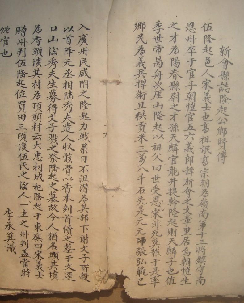 伍氏系出汴粱,先世有仕宋为岭南第十三将,卒於官,遗其二子,新会遂有绿围之伍,曰朝佐,曰朝恺,今为绿围始迁之祖。而氓又始迁之祖师自出,所谓第十三将者是也。氓以上世次莫详,今断自可知以氓为第一世。自氓而下,或隐或仕,垂三、四百年。黎贞,字彦晦,号陶陶生,晚号秫坡,学者称秫坡先生,广东新会都会村人,明代岭南一位名人,是新会当时笫一才子,著名教肓家。陈献章(1428—1500)明代思想家、教育家、书法家、诗人,广东唯一一位从祀孔庙的明代硕儒,主张学贵知疑、独立思考,提倡较为自由开放的学风,逐渐形成一个有自己特点的学派,史称江门学派。字公甫,号石斋,别号碧玉老人、玉台居士、江门渔父、南海樵夫、黄云老人等,因曾在白沙村居住,人称白沙先生。