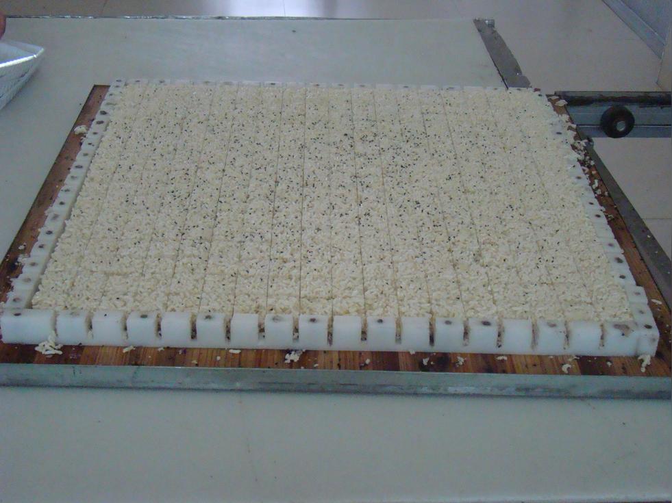 (9)成型切割:把搅拌均匀的热米花糖趁热按标准比例倒入模盘里,先用工具推平,然后放入推槽内,开机来回趁热压平,把压平冷却后的米花糖连同模盘一起放在活动推框内,开动电机慢慢向逆时针方向进行切割。