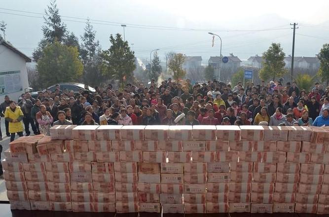 2014年1月14日,四川凉山州冕宁县复兴镇建设村,村民喜领分红款。当日上午,凉山州冕宁县复兴镇建设村的340多户村民们迎来2014年最大的新年礼物——2013年分红大会1311.5万元的入股资金红利返还。现场,重达312斤的人民币现金一捆捆整齐地放在台上,340余户入股村民排队领钱,最多的一户领到了30万元,最少的也有近万元。获得荣誉