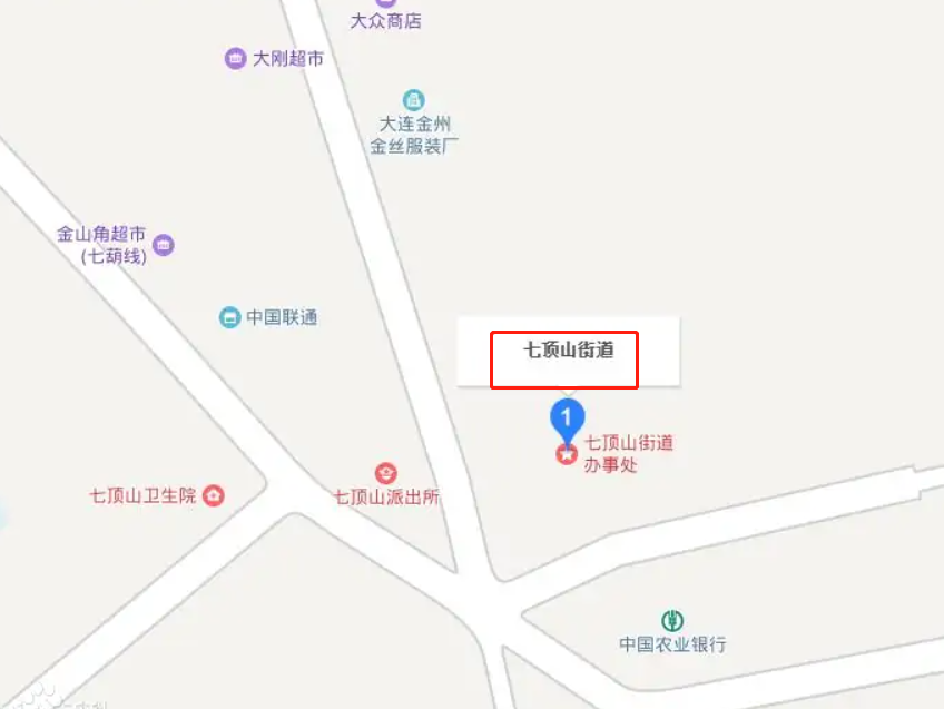 七顶山街道地处金州区西北部,东与三十里堡街道相连,东南与二十里堡街道毗邻,南与大魏家街道接壤,西、北分濒渤海、普兰店湾。距区政府17千米,辖区东西最大距离22千米,南北最大距离14千米,总面积141.4平方千米。另有海域75.4平方千米。